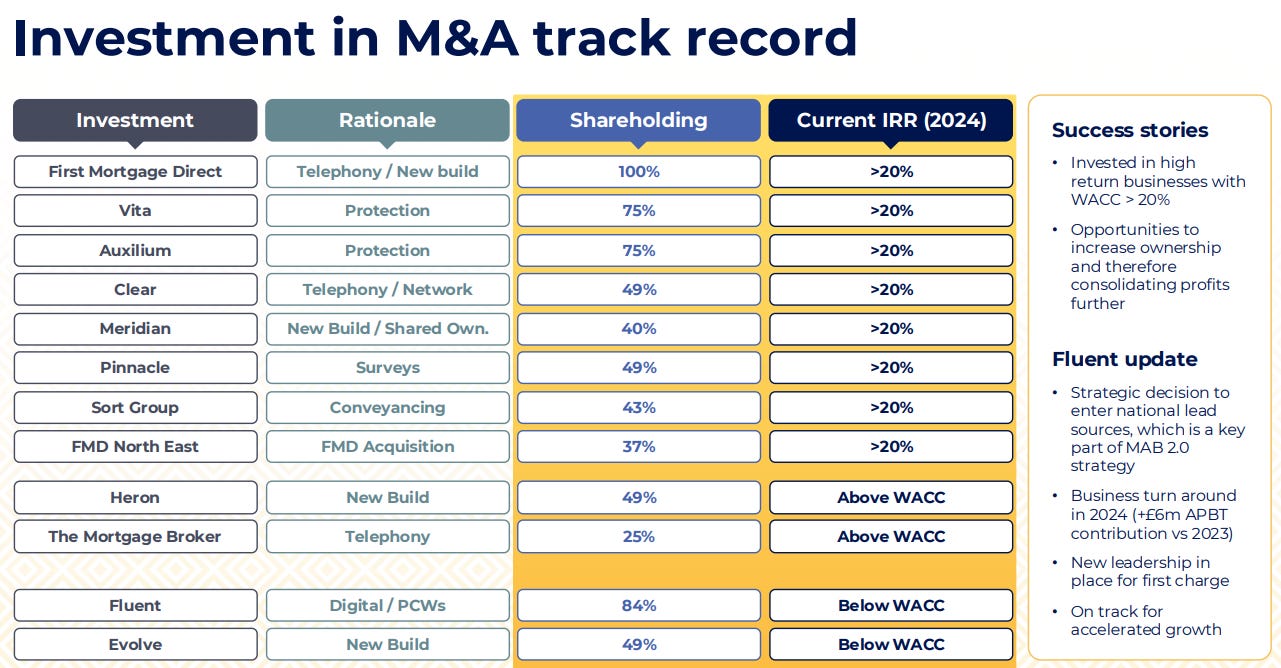 Growth driven by more advisors and 35% growth in house purchases in line with the overall market. Confirms trading in line with board expectations multiple times without mentioning what they look like. M&A part of the strategy, internal hurdle rate of 20% for deals. Debt-free. ~10£m FCF in H1. High growth seems unsustainable, rather attributable to a market rebound after 2023’s rate hikes. 16x fwd. P/E (Koyfin), 3% dividend. What I like a lot is their overview of M&A activity: