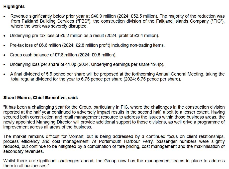 Looking at the last 5 years, 2020-2022 were flat, while 2023 saw a big jump in revenue (probably M&A?). 2024 was flat again and 2025 has been a down year. Looking as the services it seems like some are very unique with high barriers to entry (e.g. ferry service) while others are unique due to their focus on the Falkland Islands. At the same time this focus limits growth possibilities. That’s why management is looking for acquisitions. The focus comes with risk as it seems, their construction division did zero revenue in 2025 (down from 11£m in 2024) because one big project was delayed. Pass.
