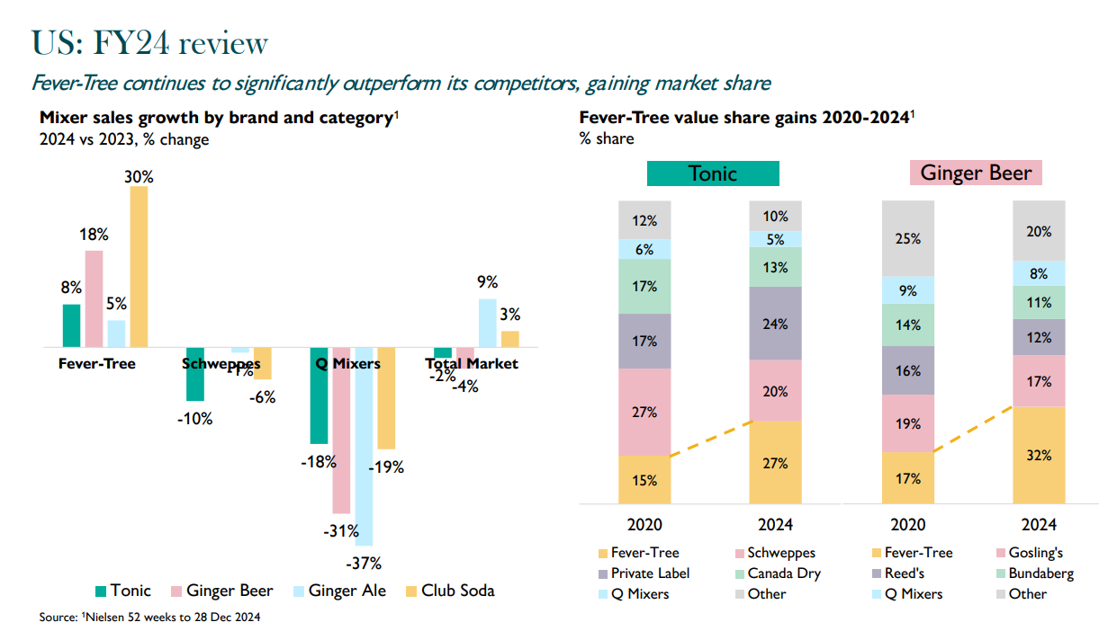 1126£m supplier of carbonated mixers such as tonic wasters, sodas, gingers, lemonades and more. Expects low single digit revenue growth for FY25 and 12% adj. EBITDA margin. Highlights successful partnership with Molson Coors in the US. 10% tariff will be splitted between both companies, but FEVR wants to increase production based in the US anyways. Molson Coors owns 8,5% of shares. 100£m share buyback ongoing (71£m + a 29£m extension), financed from the Molson Coors deal as it seems. 6% insider ownership. CEO and CFO joined in 2014.