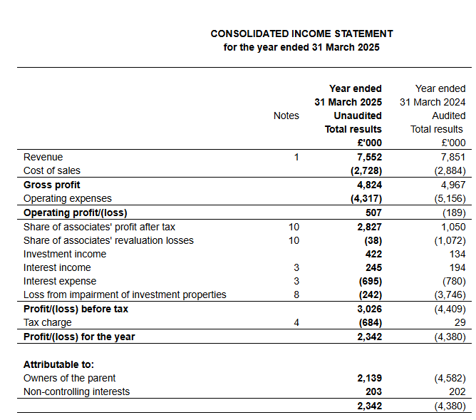 4£m advisor for property fund management, property asset management, investment broking, valuations, rating and development. FY25 was flat in terms of revenues while employee expenses grew, leading to decreased profits. No long-term debt and 4,2£m in cash. Outlook: