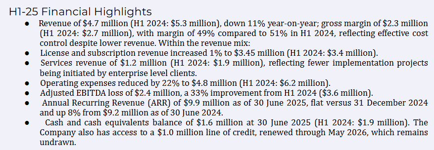 Most revenues recurring and cost reduction ongoing. Board expects revenue for FY25 to be 12-13£m. CFO will step down in September. CEO is the founder who owns 20%, his brother owns 10%, brother in-law owns another 4%. Far from profitability, pass.