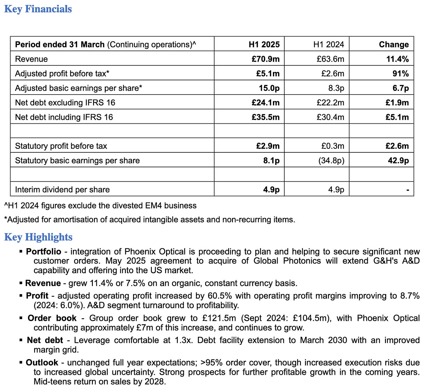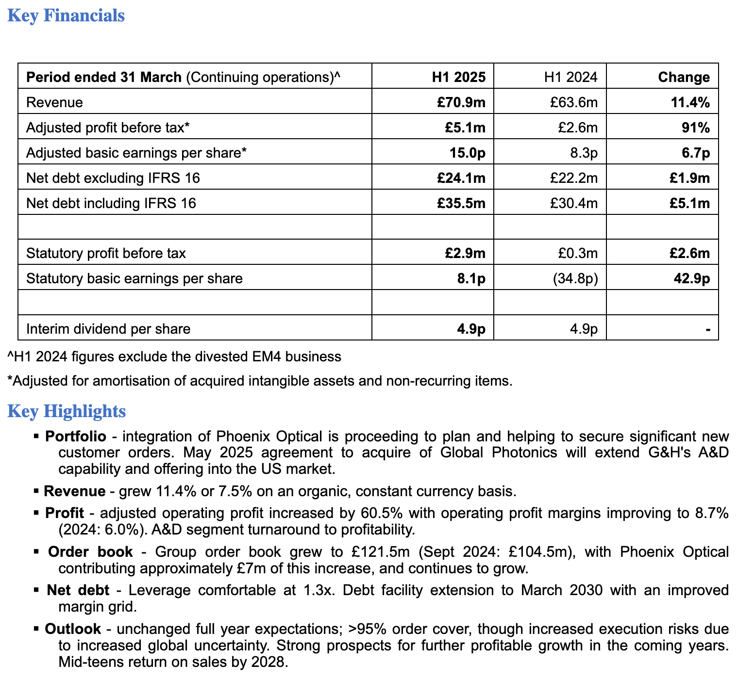 152£m provider of photonics engineering and manufacturing solutions used in life sciences, industry, telco, defense and space. CFO will step down in September. Just acquired Global Photonics in the US for 17,5$m, 50% of that in new shares. Paid about 10x EBITDA. Recent results looking good: