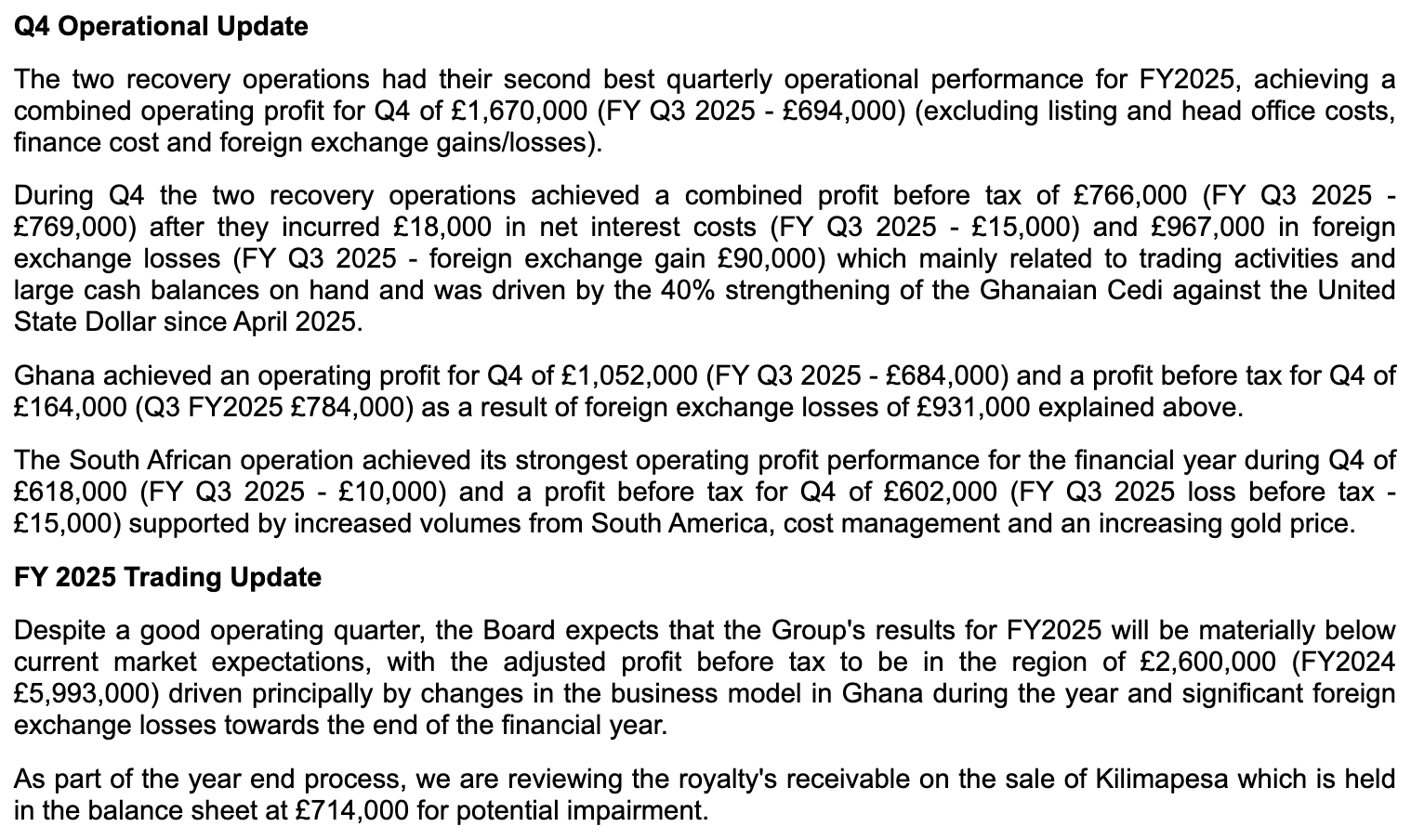 14£m Mining Services Group offering international gold recovery operations. Operates highly profitable, but suffering from exchange losses.