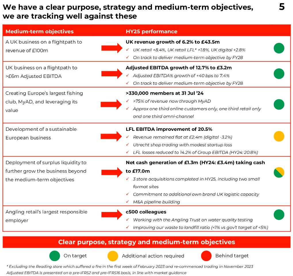26£m omni-channel specialist fishing tackle retailer who bought back 5% of outstanding shares since Dezember. Got 54 stores and 2 distribution centers. Most revenues are generated through their own fishing club MyAD. Seem to be going into M&A by acquiring other stores. Aiming to expand in Europe, currently making losses there. Medium-term targets: