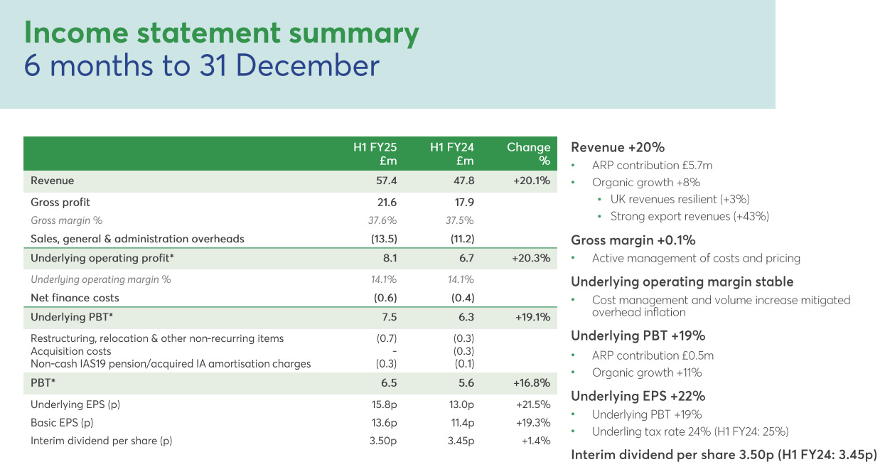 125£m supplier of premium building products, systems and solutions like water management solutions roofing products. Recent H1 update shows a solid performance: