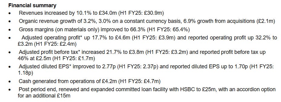 Once a really popular serial acquirer benefiting from Covid, owned it for 1,5 years. 78£m ‘buy and build group, focused on companies which design and manufacture specialist lab equipment, industrial & scientific sensors and industrial & scientific products’. Old CEO who is responsible for the great growth story until the Covid peak left in 2024 and the recently appointed COO took over. The focus then was to stabilize the group. H1 results suggest this was successful: