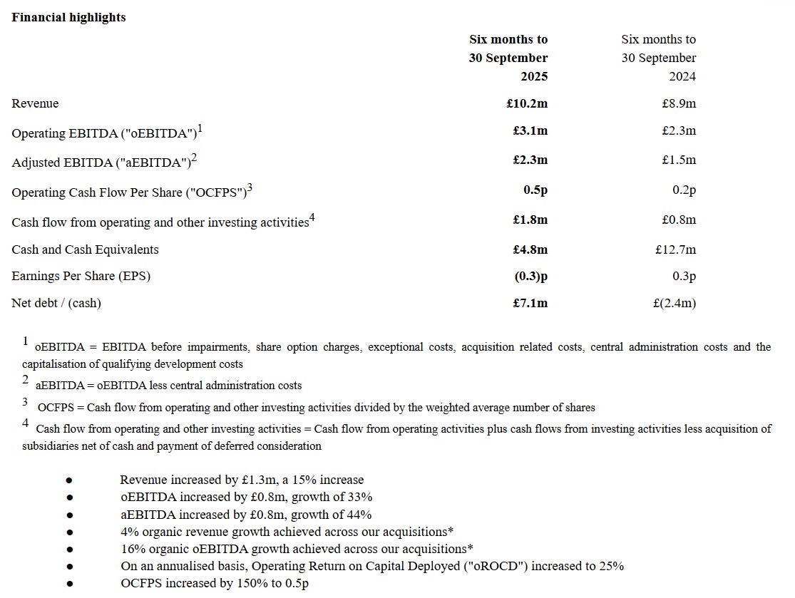 93£m serial acquirer describing its plan as: ‘to be a leading serial acquirer and operator of Vertical Market Software (VMS) businesses in the UK and Ireland - a permanent home for software leaders, teams, and customers’. H1 results: