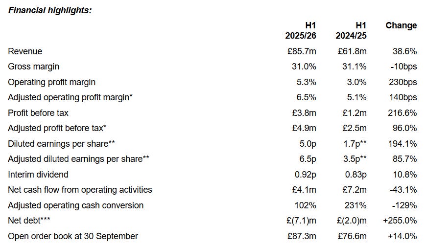 Revenue growth driven by large contracts in the communication sector. Order book at 30th November of 97£m, highlights various big contracts wins. Expects to deliver on market expectations of 145£m revenue and 7,2£m adj. PBT → 12,5 P/Adj. PBT. Suffering from a weak industrial market, but sees first signs of improvement. No material insider ownership. 30% defense exposure. Acquiring regulary, two companies in 2024. A large 33£m acquisition in 2022. Wants to grow organically by developing sales channels for own brand products, expanding facilities and expand in the US. 1,5% dividend. Some customer concentration from time to time, e.g. 20% of revenue from one customer in 2024. Looks like an alright business, benefiting from defense spending, suffering from weak industrial markets. Rather a pass.