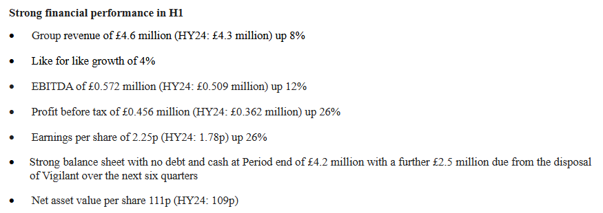 from a year ago:Ytd two locksmith businesses have been acquired for 0,35£m. Management is confident to proceed with its acquisition strategy going forward. Got no debt and 4,2£m cash. Expects 2,5£m over the next 6 quarters from its segment sale in 2023. Interim results look solid: