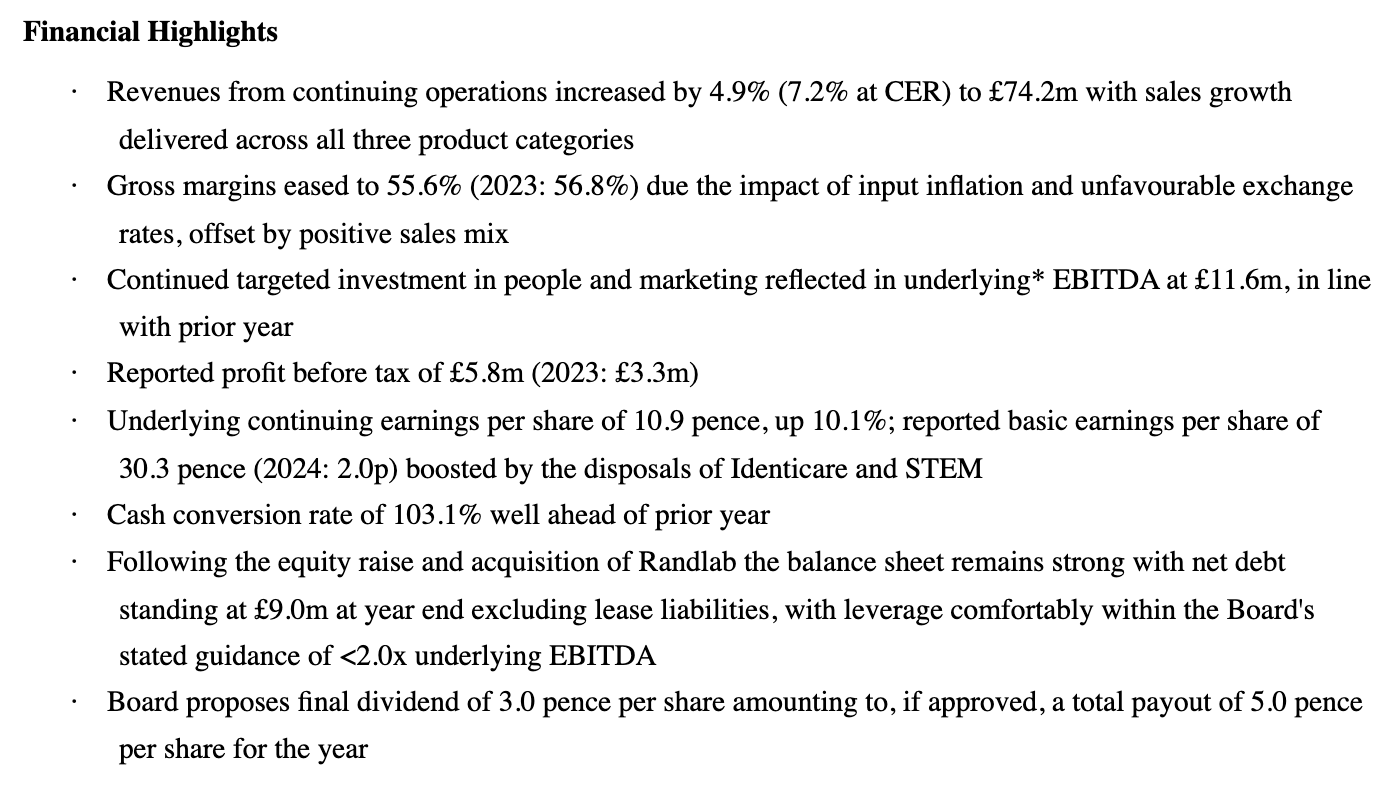 Disposal of Identicare for 17x EBITDA, delivering £25m to the Group. Exited STEM JV at c.2x of original investment. Mentioned Randlab bought for 60£m (11x EBITDA). 2% dividend. 70% of revenues from own IPs or from long-term license agreements. 30% from distribution. Rationalised portfolio from 300 to 150 brands.