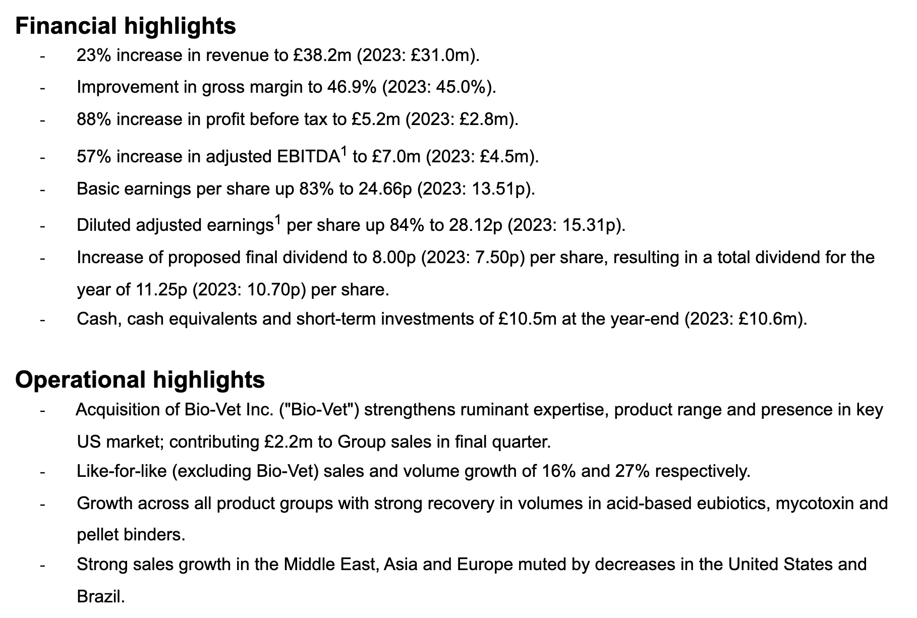87£m manufacturer of natural sustainable animal feed additives for health, nutrition and biosecurity. Seems to be focused on livestock. Just launched a new 1£m buyback programme, returned 9£m to shareholder in 2023 by a tender offer. 2% dividend. Recent results show a strong performance: